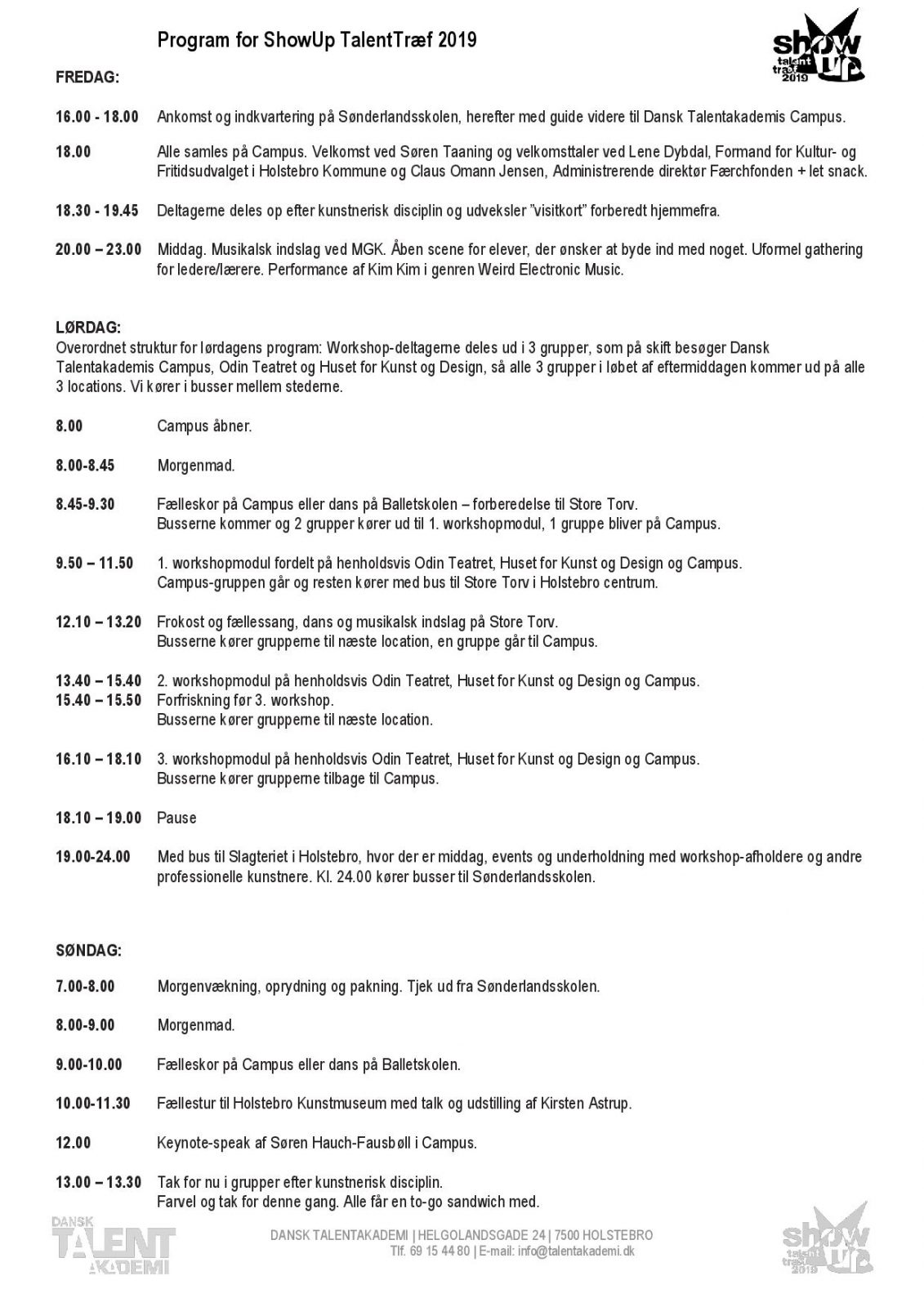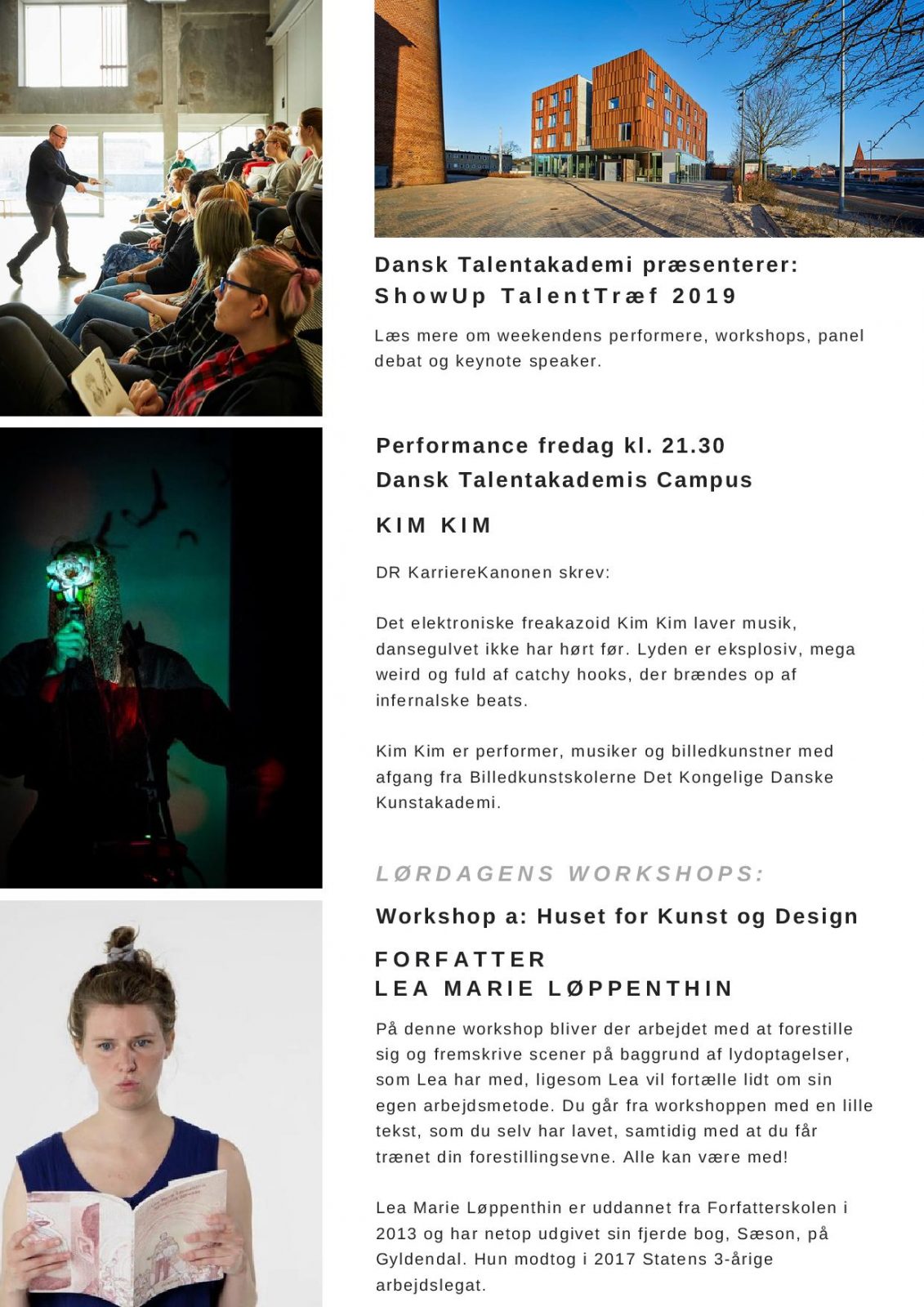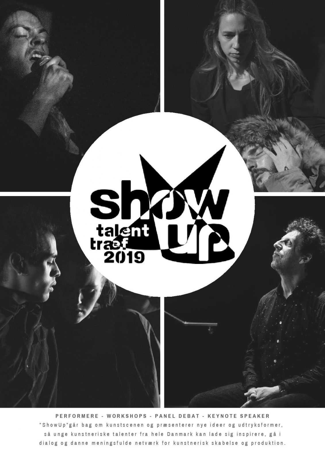 ShowUp TalentTræf 2019 er en flerfaglig kunst- og talentfestival for unge kunstneriske talenter på tværs af discipliner og kunstarter med et alsidigt program bestående af inspirerende oplæg, paneldiskussioner, kunstneriske performances og workshops af professionelle kunstnere.